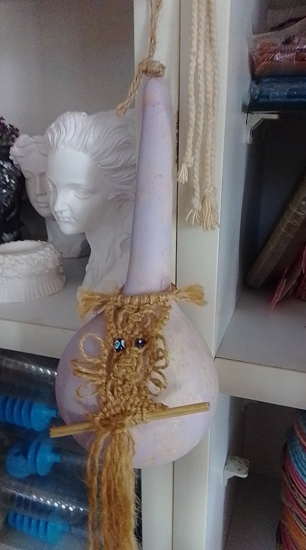 Pastel tonlarda beyaz renkte, makrome detaylı dekoratif figürin. Mavi boncuklar ve ahşap çubuk ile süslenmiştir.