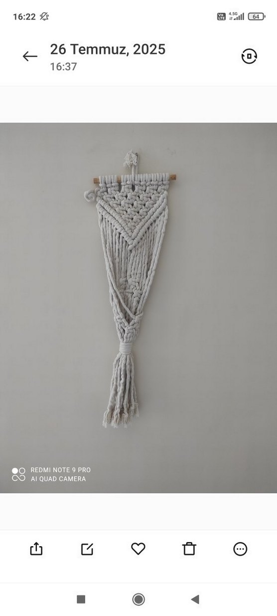 İnce düğüm detayları ve püskülleriyle beyaz makrome duvar süsü, ev dekorasyonuna doğal bir dokunuş katar.
