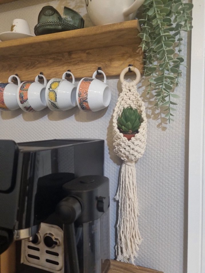 Küçük sukulent saksısını tutan beyaz makrome askı, mutfak köşenize doğal bir dokunuş katıyor.
