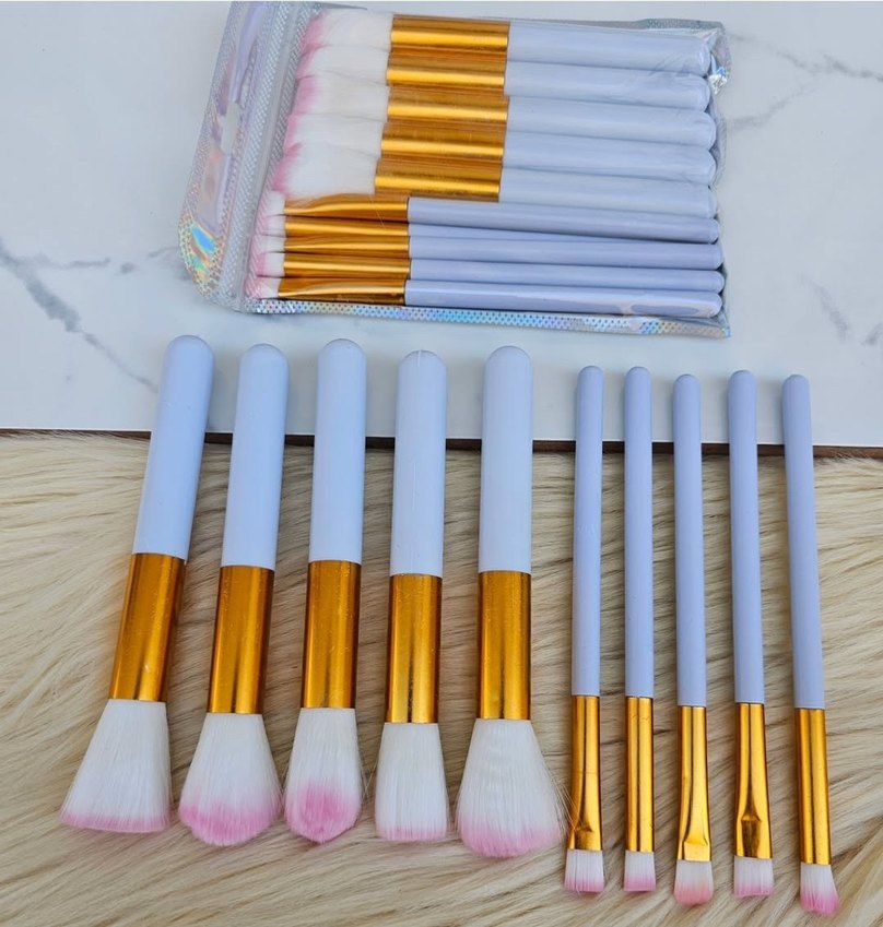 Beyaz saplı, altın renkli bağlantılı ve pembe uçlu yumuşak kıllara sahip 10 parçalık makyaj fırça seti. ️