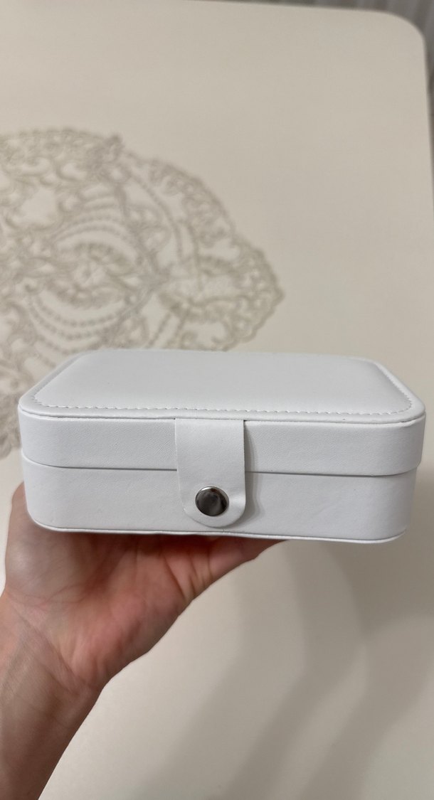 Düz beyaz yüzeyli, güvenli çıtçıt kapaklı makyaj organizer kutusu.