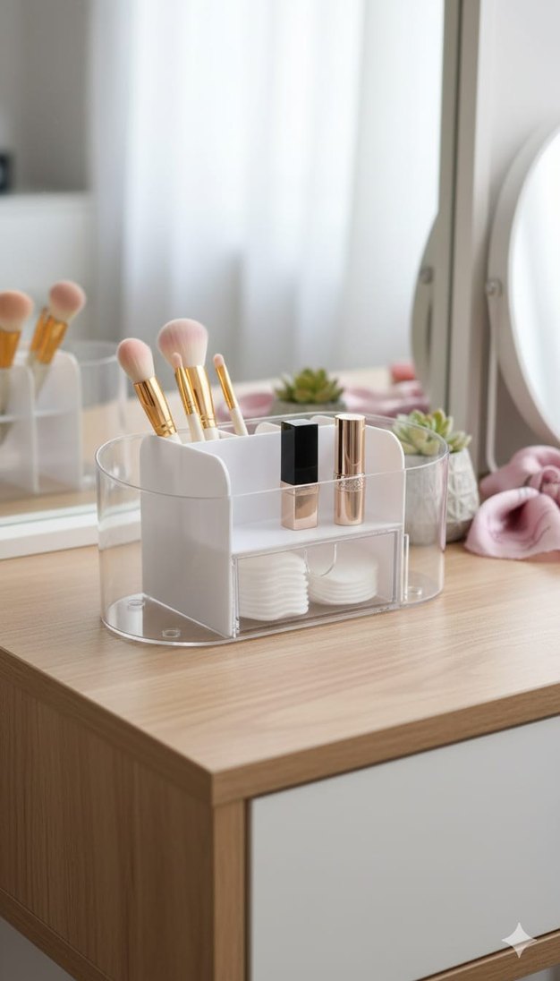 Beyaz makyaj organizer kutusu, fırçalar, rujlar ve pamuk pedler için bölmelerle düzen sağlar.
