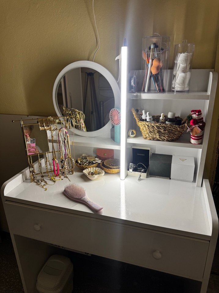 Çok bölmeli beyaz makyaj organizerı, fırçalar, pamuklar ve takılar için. Yuvarlak ayna ve ek depolama için beyaz çekmece içerir. ✨