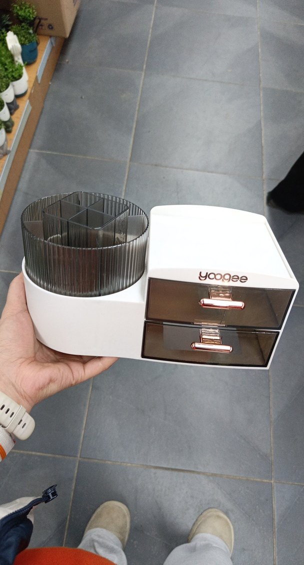 Beyaz makyaj organizerinde iki çekmeceli, rose gold kulplu ve bölmeli yuvarlak kısım bulunur. Üzerinde "ycogee" markası yer alır.