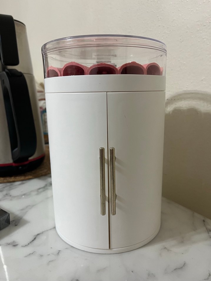 Silindirik beyaz makyaj organizerı, 4 çekmeceli iki gümüş renkli kulplu kapaklı ve şeffaf üst bölmeli.