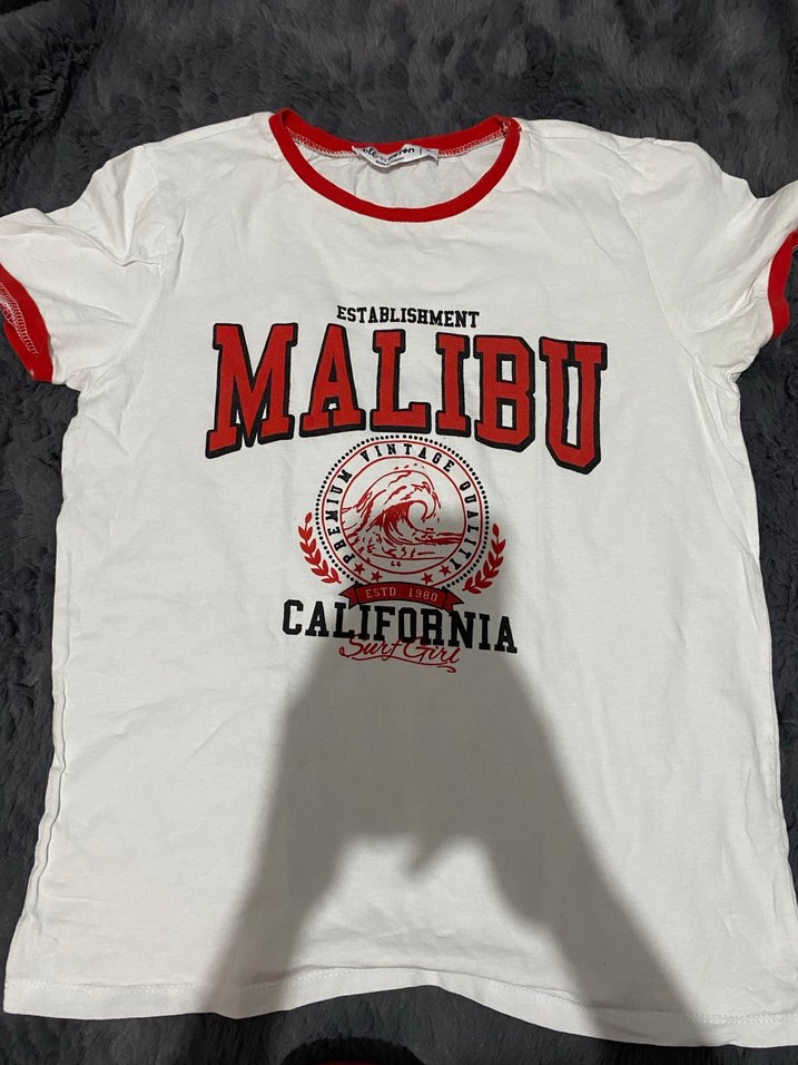 Beyaz pamuklu, kısa kollu ve bisiklet yaka, Malibu California baskılı dar kesim tişört. Günlük rahat sokak stili için uygun. kullanmadım