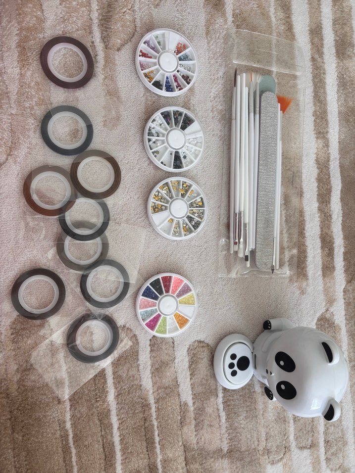 Bu manikür ve pedikür seti çeşitli tırnak süsleri, fırçalar, törpüler ve panda şeklinde tırnak kurutucusu içerir. Açık ve beyaz tonlardadır.