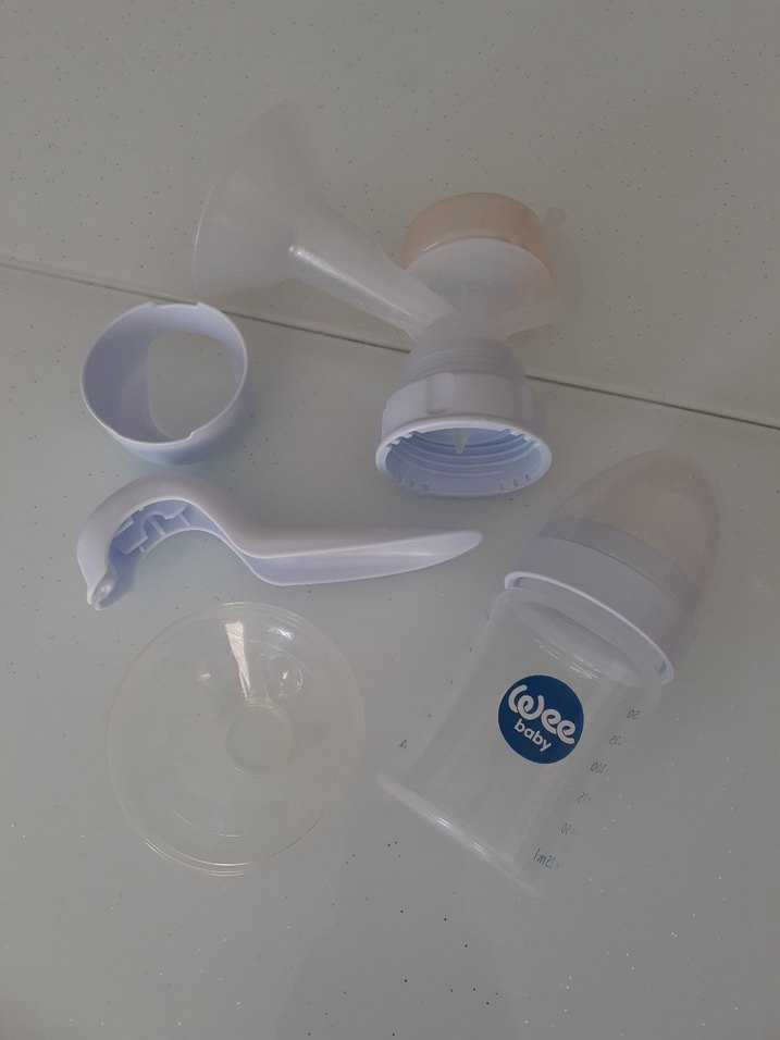 Beyaz manuel göğüs pompası seti, göğüs aparatı, sap, biberon ve kapaktan oluşur. Kolay süt toplama ve saklama sağlar.