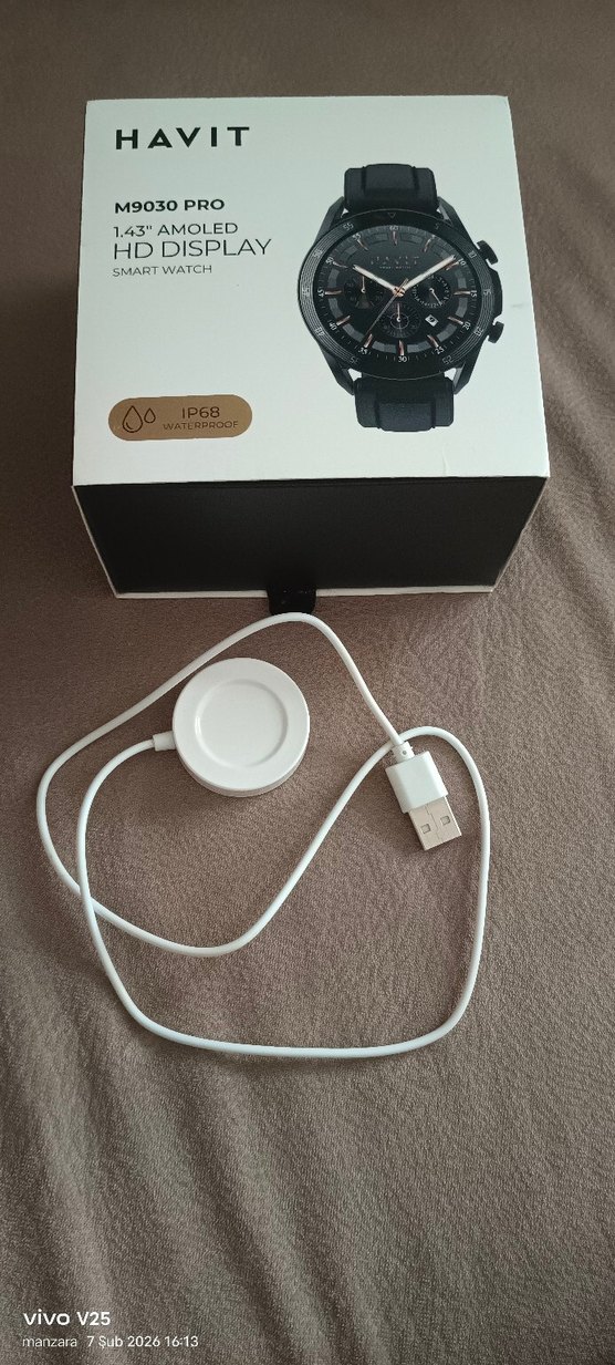 havit akılı saat ve kutusu beyaz manyetik şarj kablosu, USB bağlantısıyla kolay şarj imkanı sağlar. ⚡