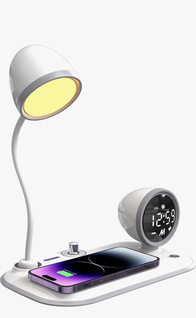 Beyaz masa lambası, esnek boyunlu ve 12:59 gösteren dijital saate sahip. Aynı zamanda kablosuz telefon şarj ünitesi olarak kullanılır. Teknolojik Ürün Olduğu İçin İade Kabul Etmiyorum İyi Alışverişler