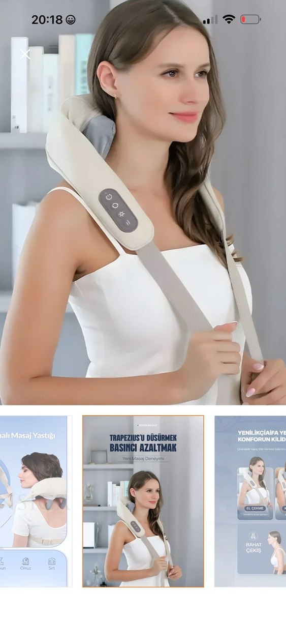 Boyun ve omuzları rahatlatan, trapezius kaslarını gevşeten beyaz masaj yastığı. Kolay kontrol paneli ile konforlu kullanım sağlar.