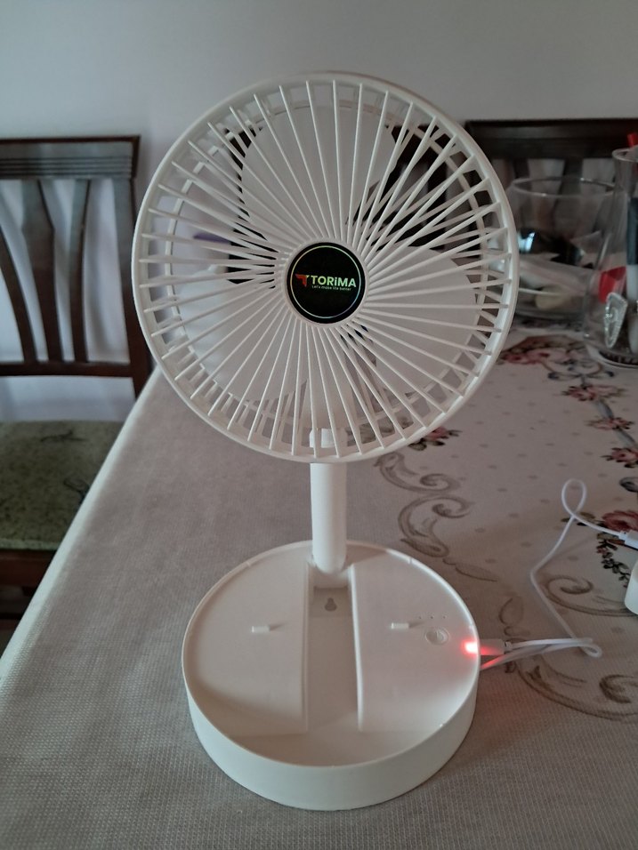 Torima marka,Ayarlanabilir başlıklı beyaz masaüstü vantilatör, basit kontrol düğmelerine sahip. Kişisel kullanım için kompakt tasarım.Doldurulabilen pil sayesinde kablolu veya kablosuz kullanılabiliyor.