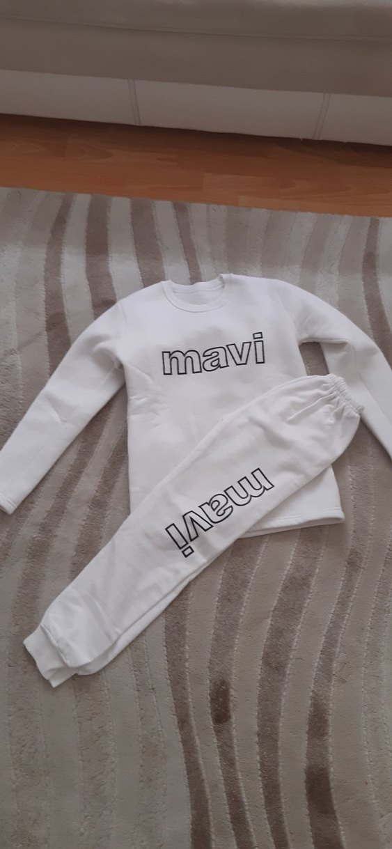 Beyaz renkte, uzun kollu, yumuşak ve rahat polar kumaştan yapılmış, "mavi" baskılı kadın sweatshirt ve pantolon takımı. Rahat kesim ve bisiklet yaka ile günlük kullanıma uygun. sade ce 1 kere gıydı