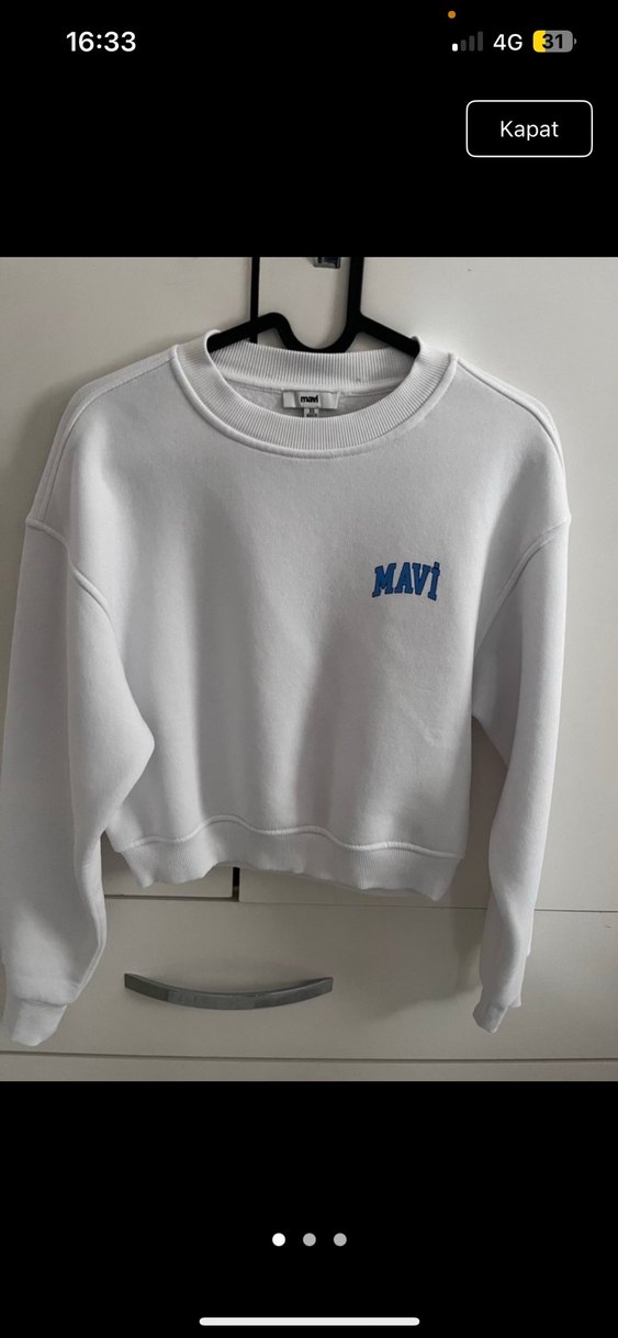 Mavi baskılı, örme kumaştan, uzun kollu, beyaz ve bol kesim sweatshirt. Günlük kullanıma uygun rahat tasarım. Yeni gibi crop model buda
