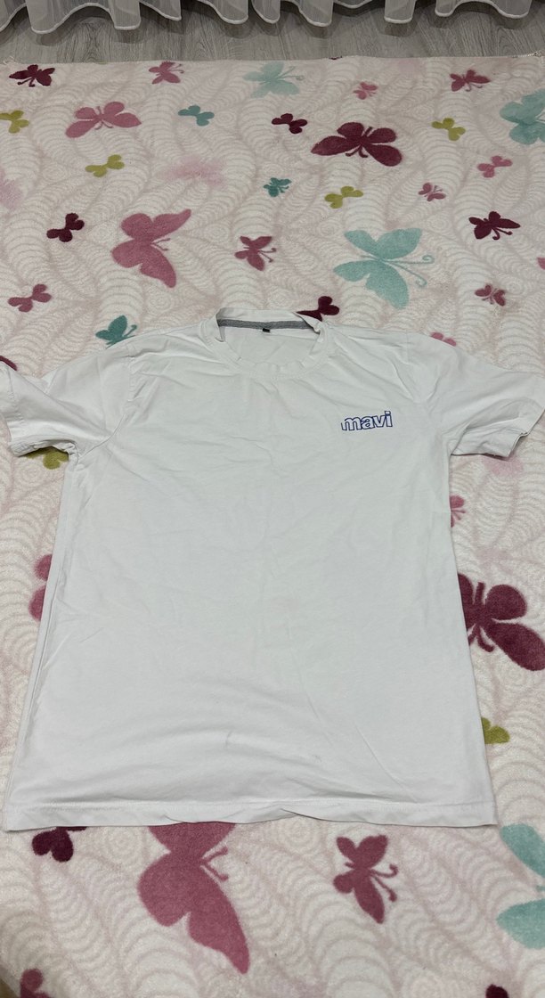 Beyaz pamuk tişört, rahat bol kesim ve yuvarlak yaka ile. Küçük Mavi baskılı logo, gündelik rahat ve sokak stilini yansıtıyor.