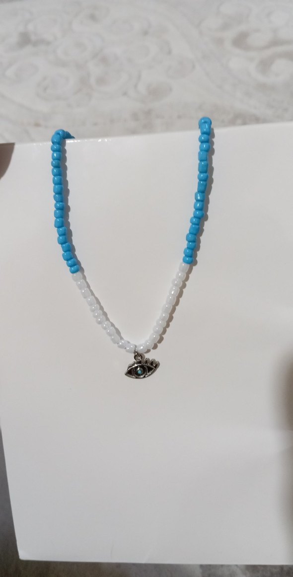 mavi ve beyaz boncuklardan oluşan, göz figürlü küçük bir charm ile bohem tarzı yansıtan minimalist kadın kolyesi.