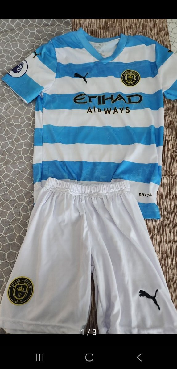 Dar kesim, kısa kollu ve yuvarlak yaka erkek forma takımı, elastik sentetik kumaştan. Beyaz ve açık mavi çizgili, baskılı ve sokak stili. Etihad Airways logosu bulunur. ⚽