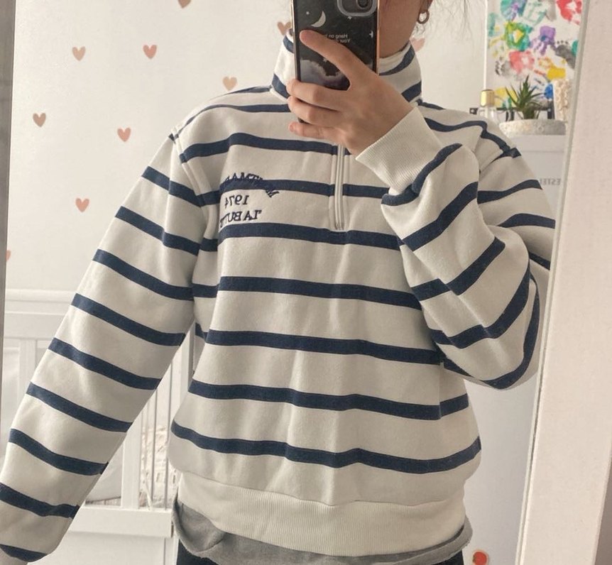 Beyaz Mavi Çizgili Yarım Fermuarlı Kadın Kazak
