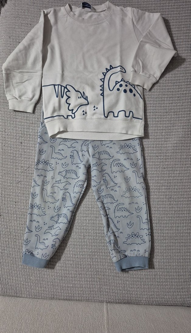 Beyaz mavi renkli, dinozor desenli uzun kollu ve bisiklet yaka üst ile tüm vücut dinozor desenli pantolondan oluşan, yumuşak ve sıcak dokulu örme kumaşlı erkek bebek takımı. Mevsimlik