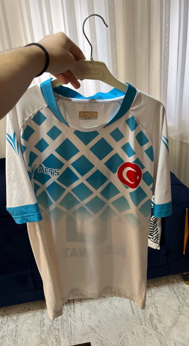 , kısa kollu, yuvarlak yakalı, beyaz ve mavi baskılı erkek spor tişörtü. Sokak stiline uygun, normal boy ve sentetik kumaştan yapılmıştır. ⚽