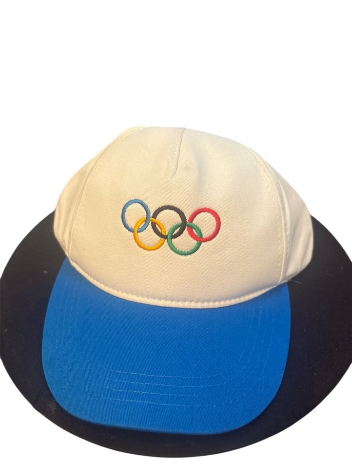 Beyaz taç kısmı ve mavi siperliği olan, nakışlı Olimpiyat halkaları logosu bulunan kadın spor şapkası.