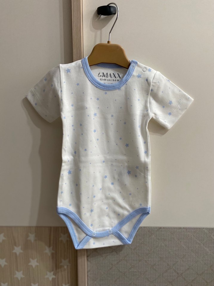 Beyaz zemin üzerine pastel mavi yıldız desenli, kısa kollu, yuvarlak yakalı pamuklu bebek body. Fiyatı 75₺ çoklu alımlarda indirim mevcuttur 6-9 9-12 ay bedenleri mevcuttur