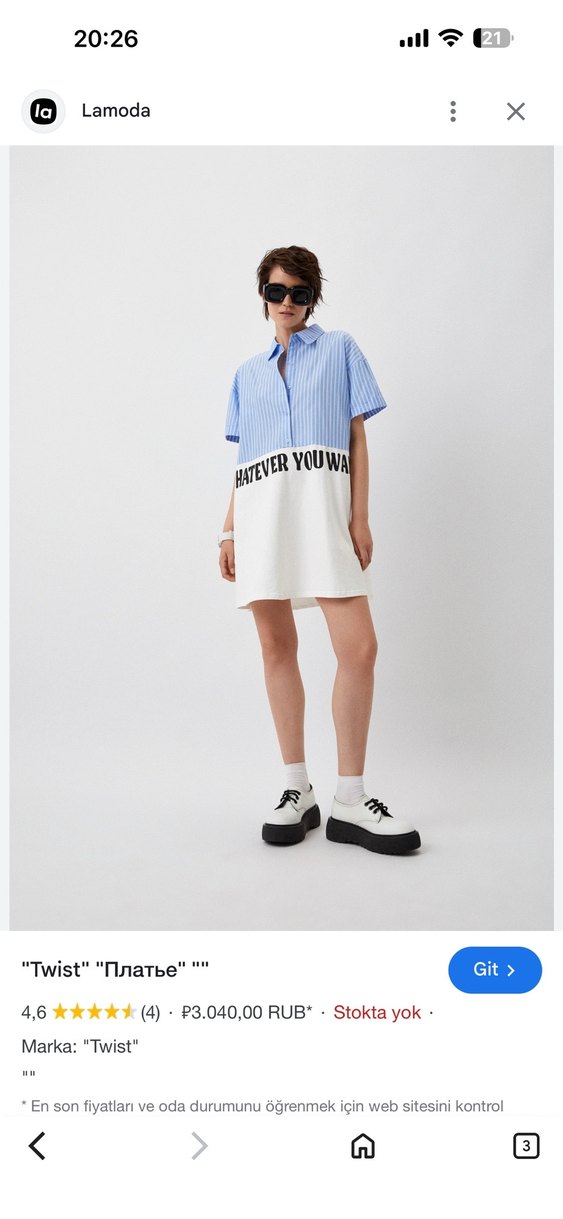Pamuklu, beyaz ve mavi çizgili, kısa kollu, yakalı, bol kesim mini elbise. Üzerinde baskılı yazılarla sokak modasına uygun.