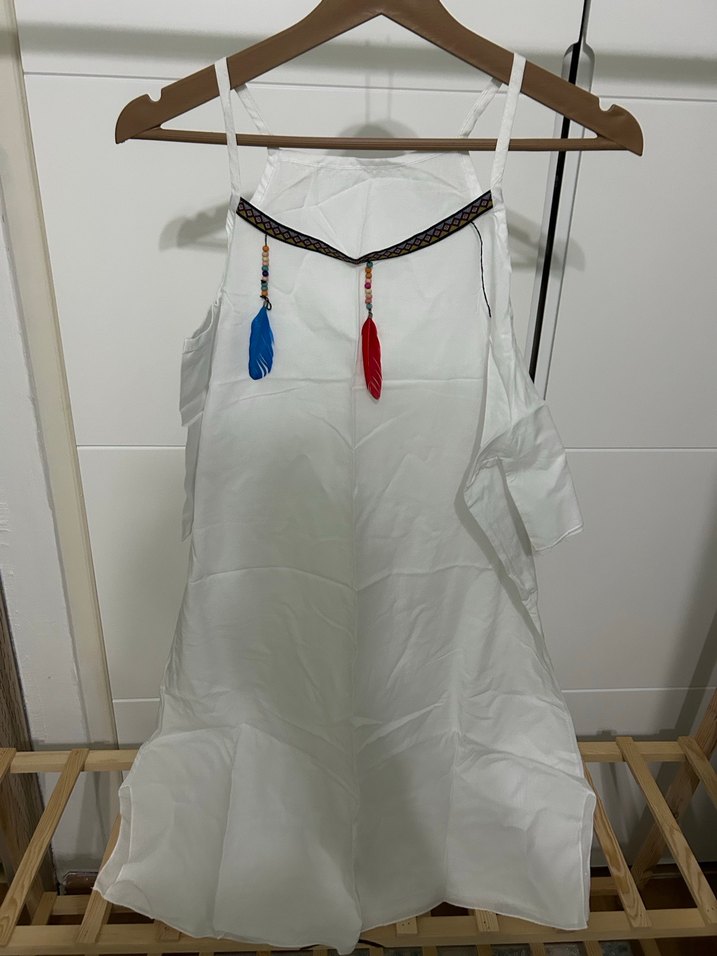 İnce askılı, renkli tüy detaylı dekoratif bantlı beyaz yumuşak kumaştan üretilmiştir. Tütün birtanesi düşmüş.
