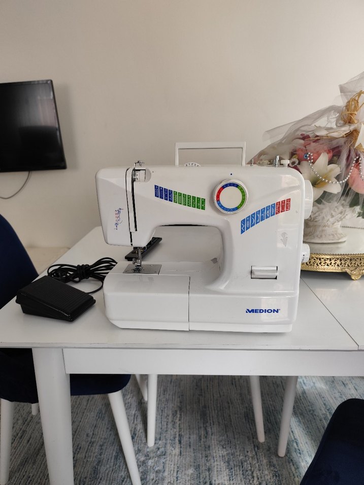 Renkli dikiş seçenekleri ve pedal kontrollü beyaz Medion dikiş makinesi.