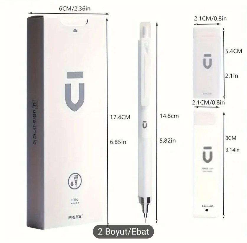 Uzunluğu 14.8 cm olan beyaz mekanik kurşun kalem, ince ve hafif tasarıma sahiptir. 17.4 x 6 cm boyutlarında sade beyaz kutuda sunulur. ✏️