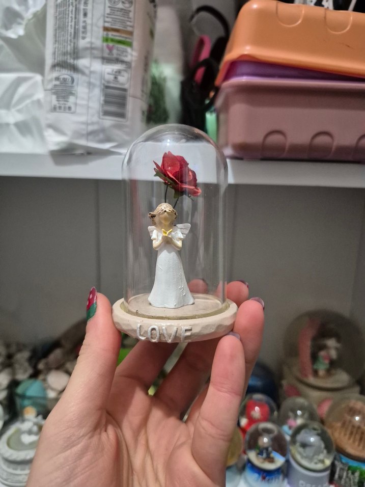 Cam fanus içinde kırmızı gül tutan beyaz melek figürü. Tabanında 'LOVE' yazısı bulunan zarif bir dekoratif ürün.