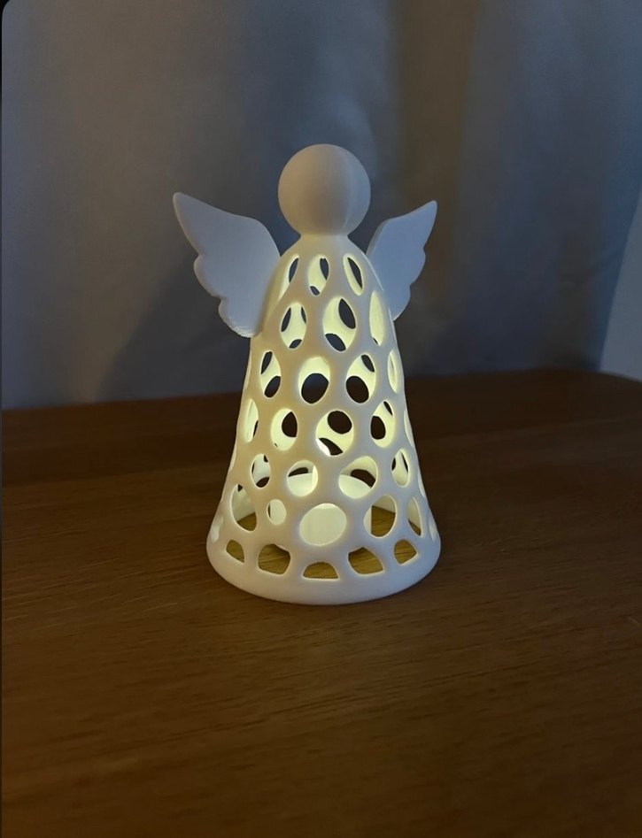 Delikli ve yuvarlak kesimlere sahip beyaz melek figür, hafif bir ışık efekti yaratır ve ortama zarif bir dokunuş katar. 3D yazıcı ile üretildi . Sarı , beyaz ve gri renklerle isteğe göre hazırlanabilir.
