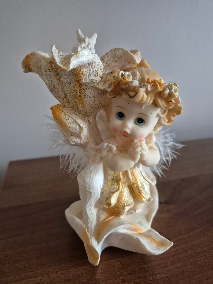 Altın detaylara sahip beyaz melek figürin, çiçek tutuyor ve narin detaylara sahip. Hafif ve zarif görünüyor.