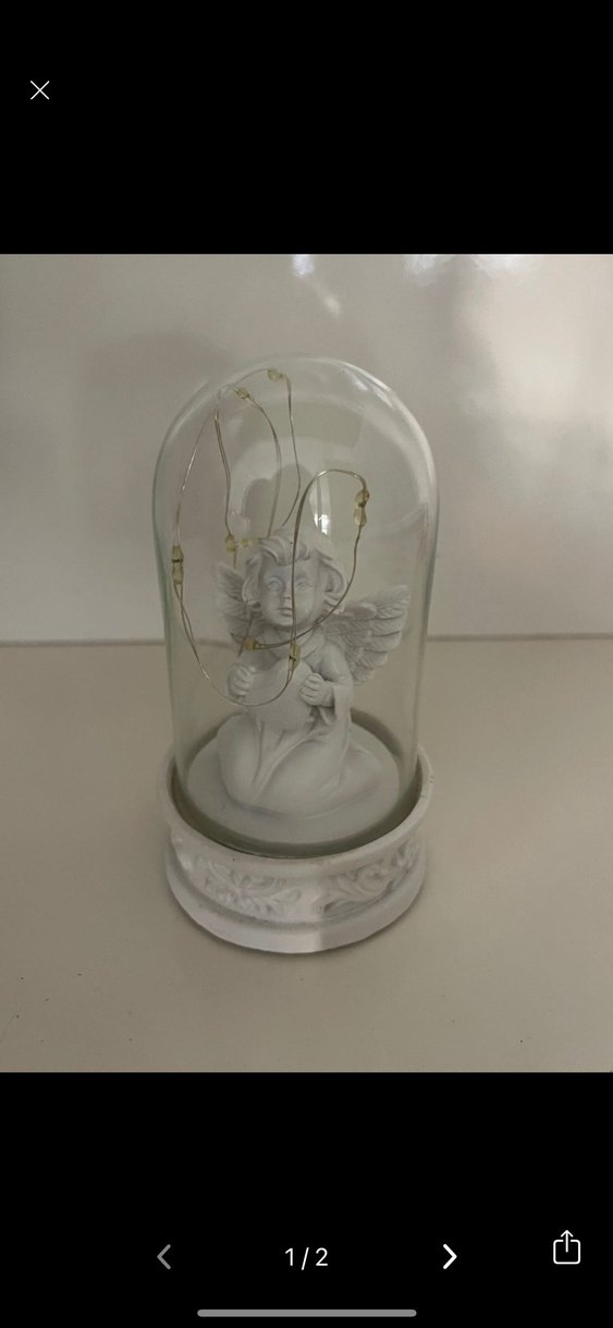 Beyaz melek figürü, şeffaf küre içinde ve dekoratif tabanda, ince ışık ipleriyle süslenmiş. Nazik bir dekoratif ürün.