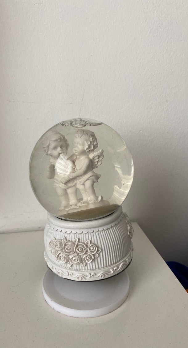 İki melek figürünün yer aldığı şeffaf küre ve detaylı çiçek desenli beyaz tabanlı kar küresi.