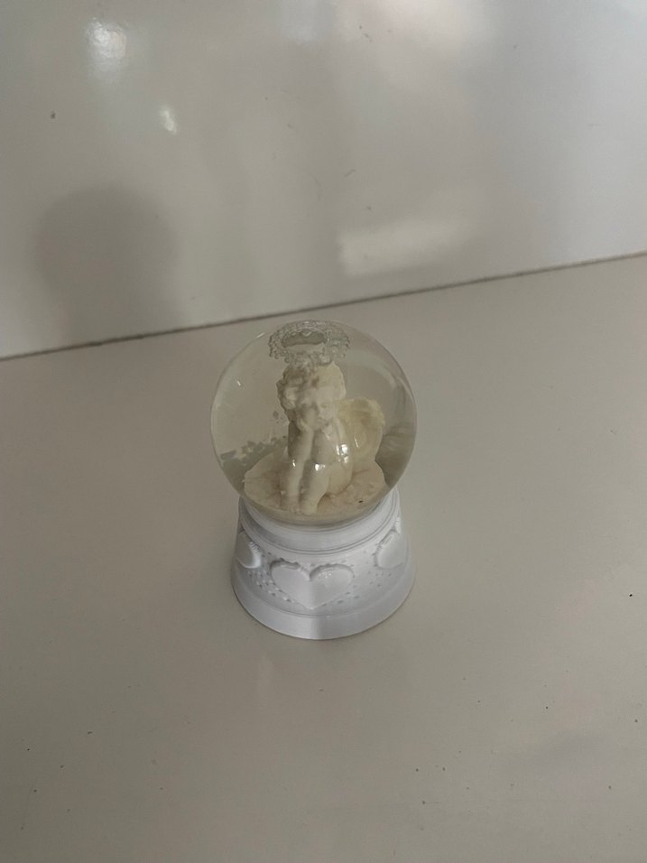 Küçük bir melek figürünün yer aldığı beyaz kar küresi, süslü tabanıyla dikkat çekiyor. ❄️
