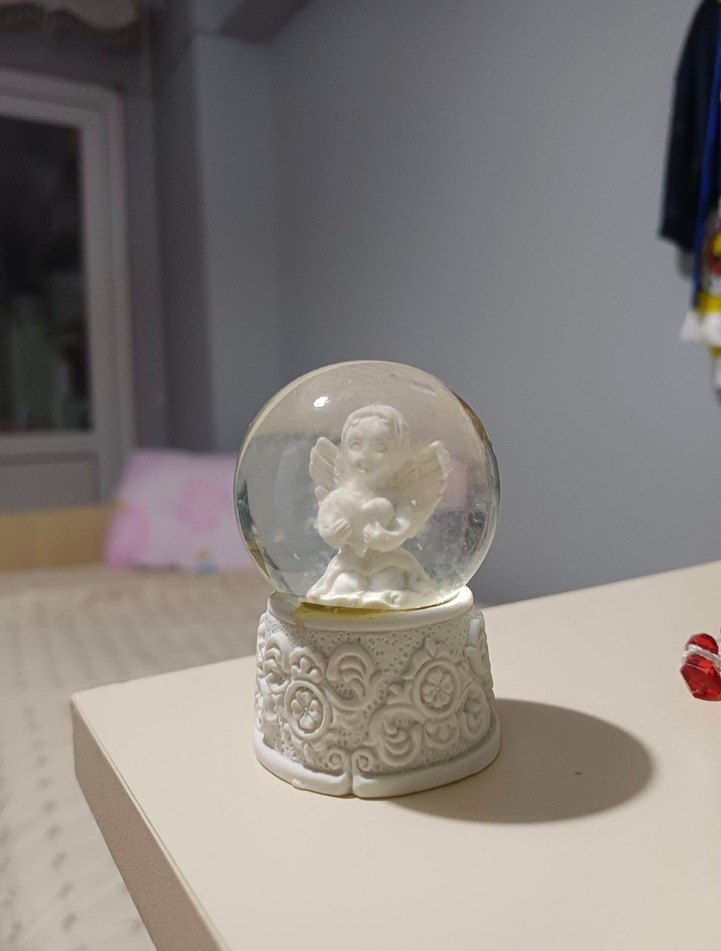 İçinde detaylı melek figürü bulunan beyaz kar küresi, işlemeli taban üzerinde duruyor. ❄️