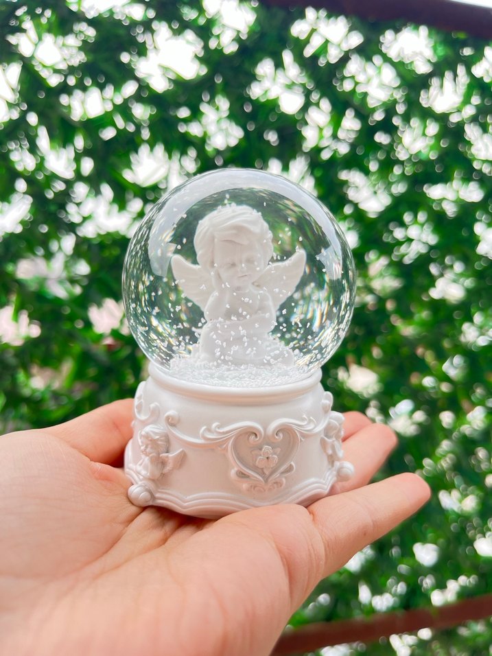Detaylı melek figürlü beyaz kar küresi, şeffaf küre ve süslü tabana sahiptir. Sallanınca hafif kar efekti oluşturur. ❄️