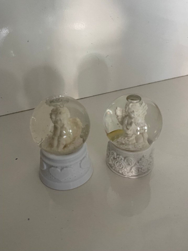 Beyaz melek figürlü iki kar küresi seti, şeffaf küre içinde detaylı figürlerle süslenmiş. Hafif ve zarif tasarım. ❄️