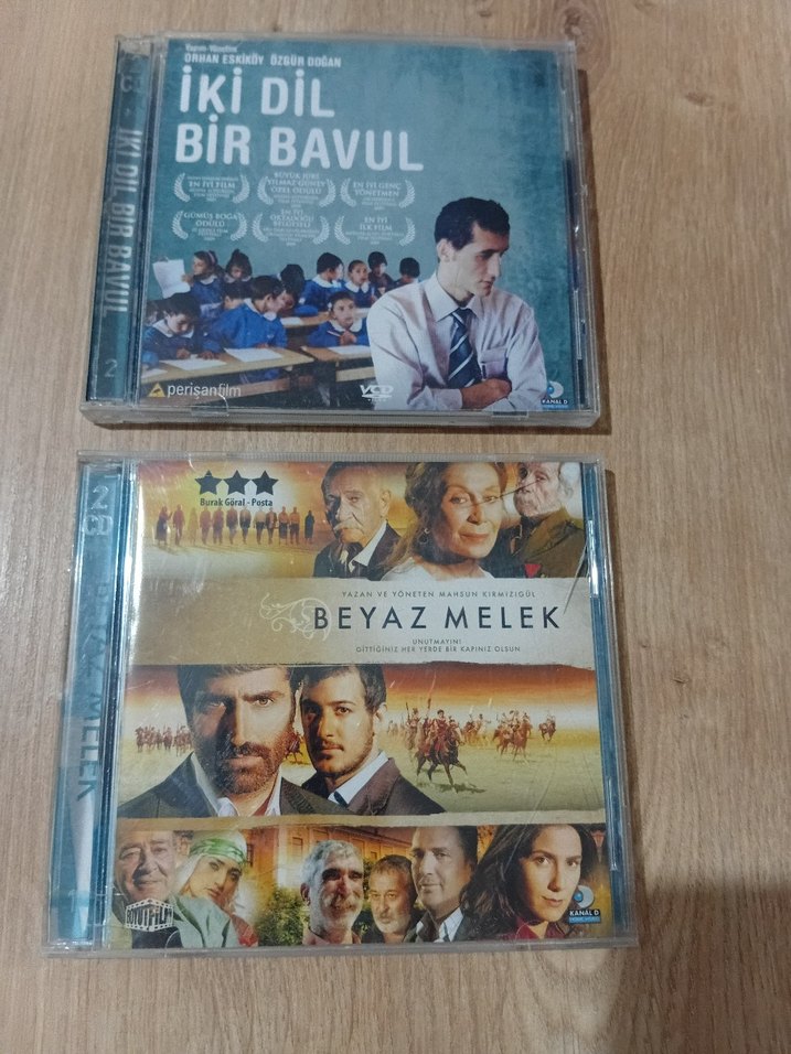 "Beyaz Melek" ve "İki Dil Bir Bavul" filmlerinin CD seti. Orijinal kutularında, kapak görselleriyle birlikte. Vcd kutularında kırık var