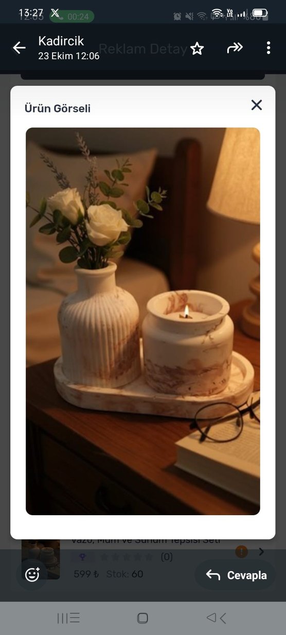 Mermer desenli beyaz mum ve uyumlu vazo, tepsi üzerinde, ortama sıcaklık katıyor. ️