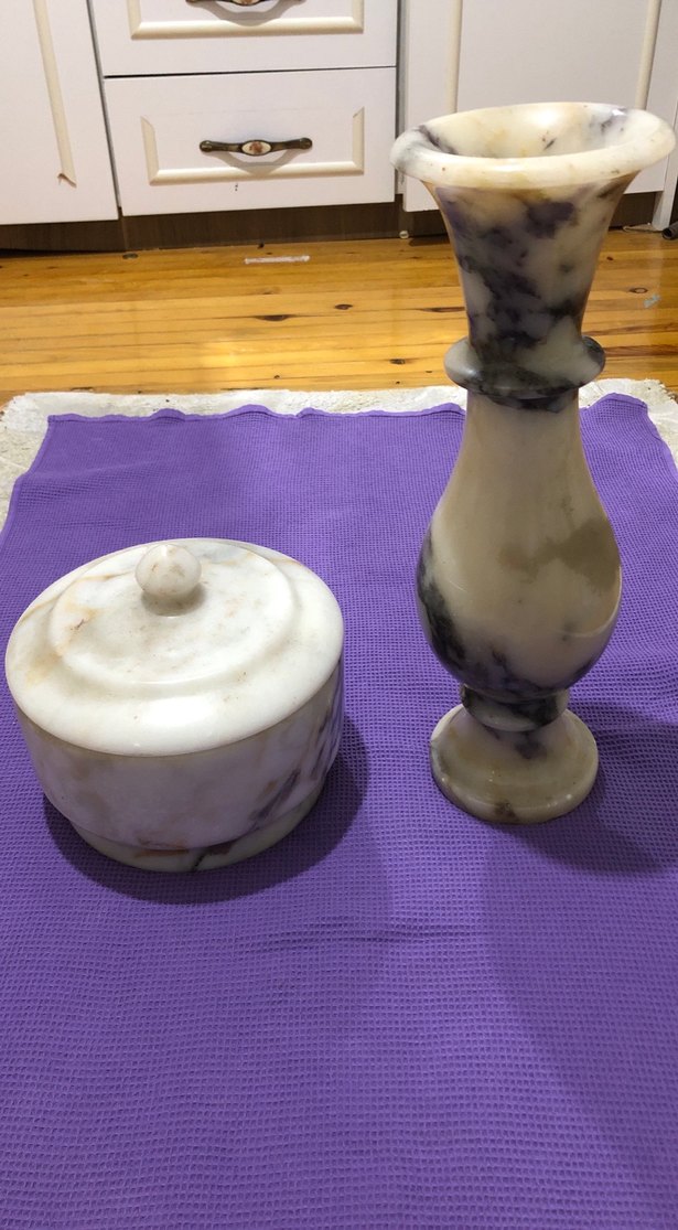 Beyaz Mermer Görünümlü Vazo ve Kapaklı Kutu