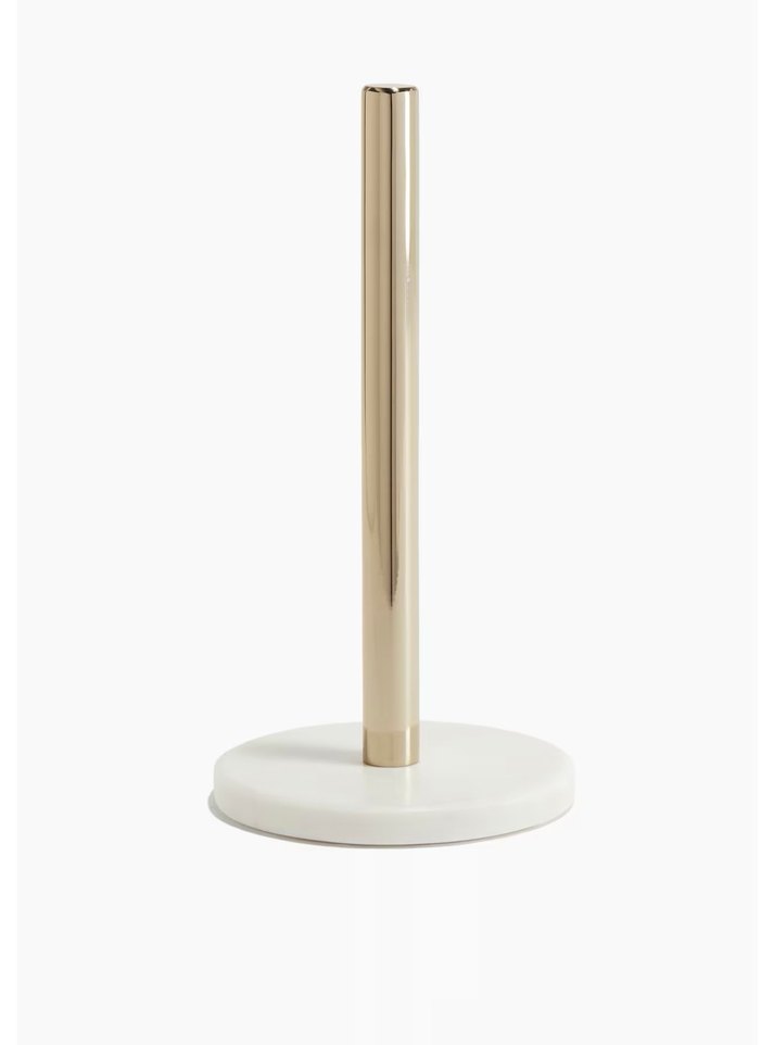Beyaz mermer taban ve ince metal çubuktan oluşan şık ve sade havlu kâğıtlık.