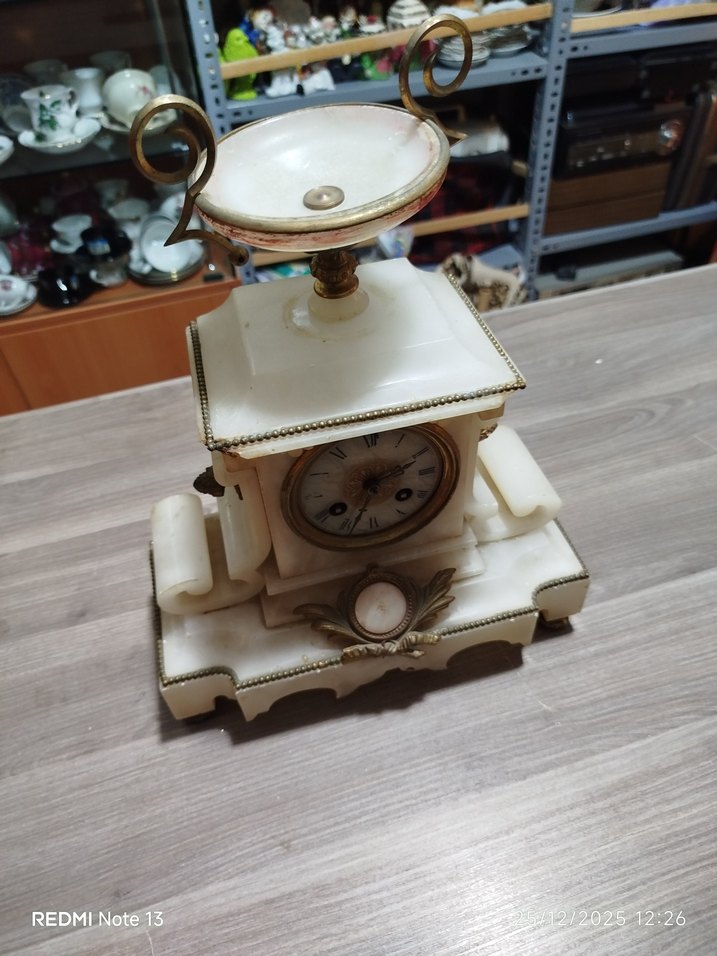 Altın detaylı beyaz mermer masa saati, yuvarlak kadranlı klasik tasarıma sahiptir ve odanıza zarif bir dokunuş katar. ⏰on saat üstü uçlarda yaşından dolayı dökülmeler mevcut