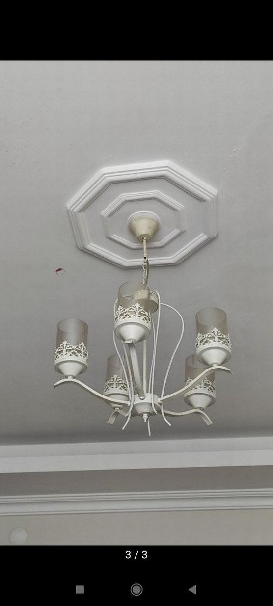 Beyaz metalden yapılmış, dört kollu, dekoratif desenli ve mat camlı avize. Tavana monte edilir, yumuşak ışık sağlar.