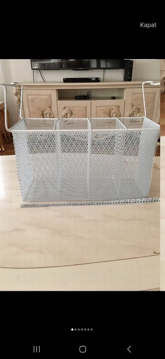 Beyaz metalden yapılmış, askılı ve bölmeli dolap düzenleyici sepet. Tüm ölçüleri görselde mevcut