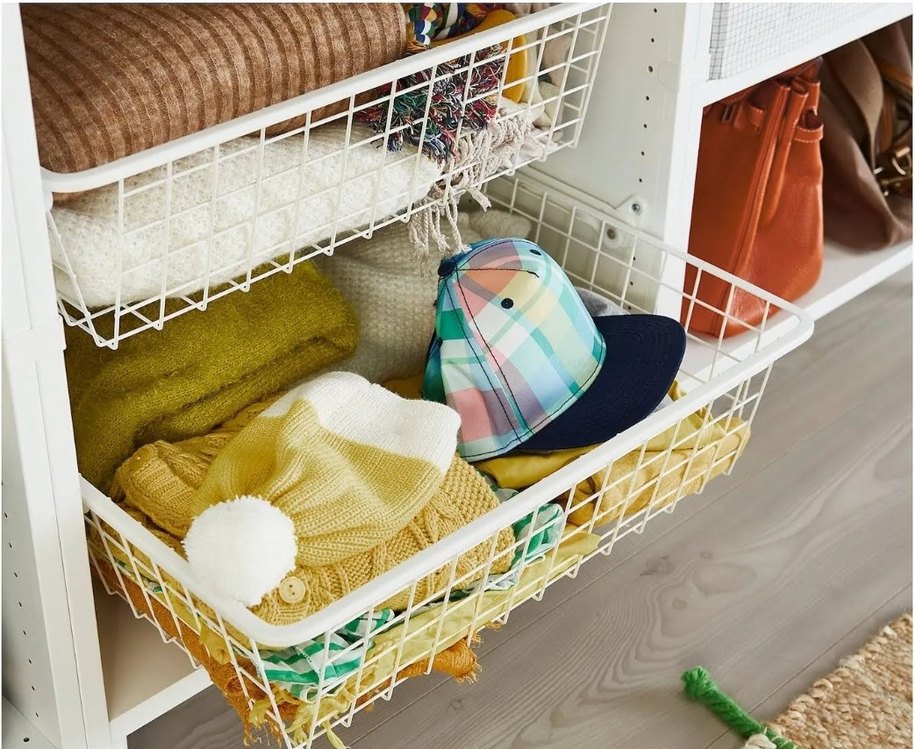 Beyaz metal telden yapılmış dolap düzenleyici sepet, kıyafet ve aksesuarları düzenli tutar. Kolay erişim sağlar.
