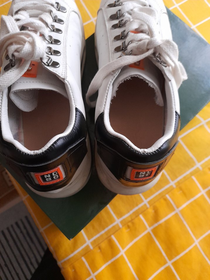 Blok topuklu, tokalı beyaz spor ayakkabı. Parlak baskılı desene sahip, spor ve günlük şıklık için uygundur.