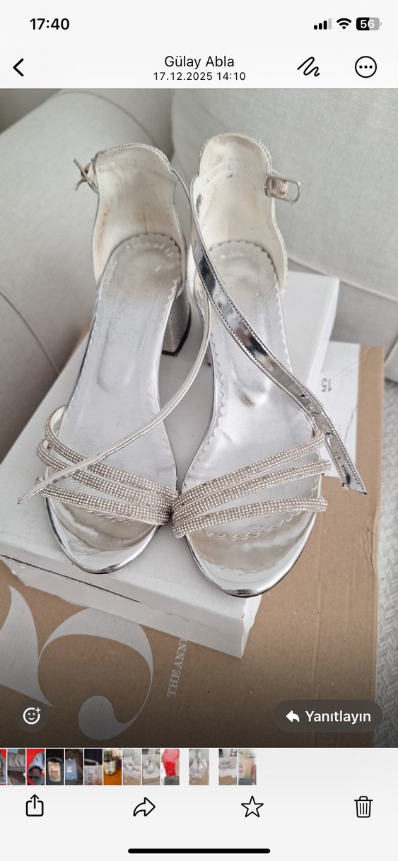 Beyaz renkte, metal malzemeden yapılmış blok topuklu, tokalı abiye ayakkabılar. Düğünlere uygun, çağdaş ve desen içermeyen tasarım.