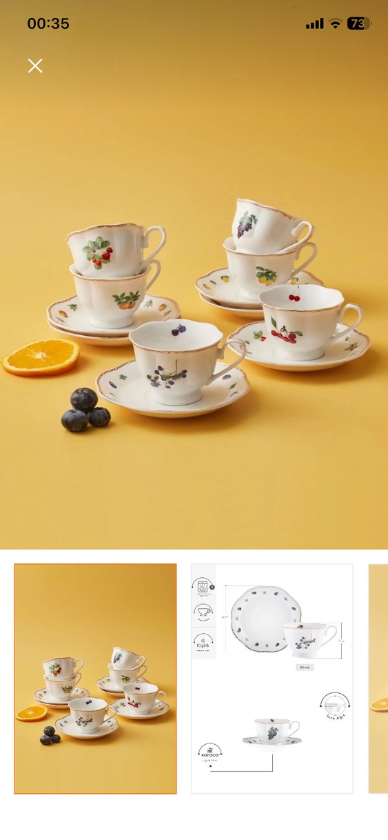 Altın detaylı, beyaz porselen meyve desenli fincan ve tabağı seti. Çay veya kahve için uygundur.